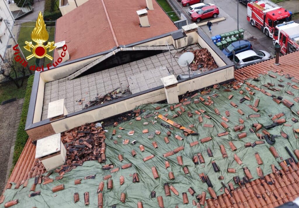 Dopo il completo spegnimento di tutti i focolai, il tetto è stato coperto con dei teli per evitare ulteriori danni dovuti alla pioggia in atto.