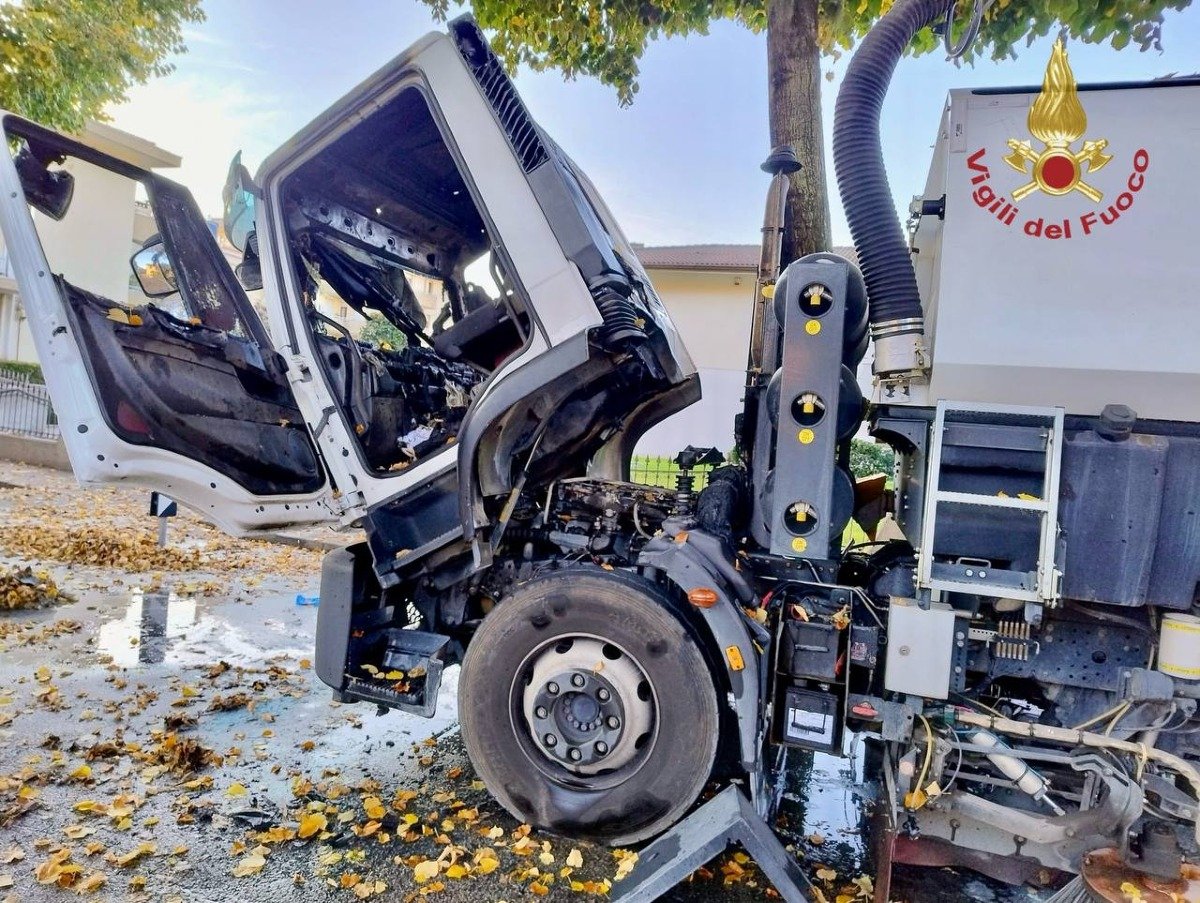 Incendio a Mansuè: macchina spazzatrice alimentata a metano in fiamme. Due operatori lievemente intossicati.