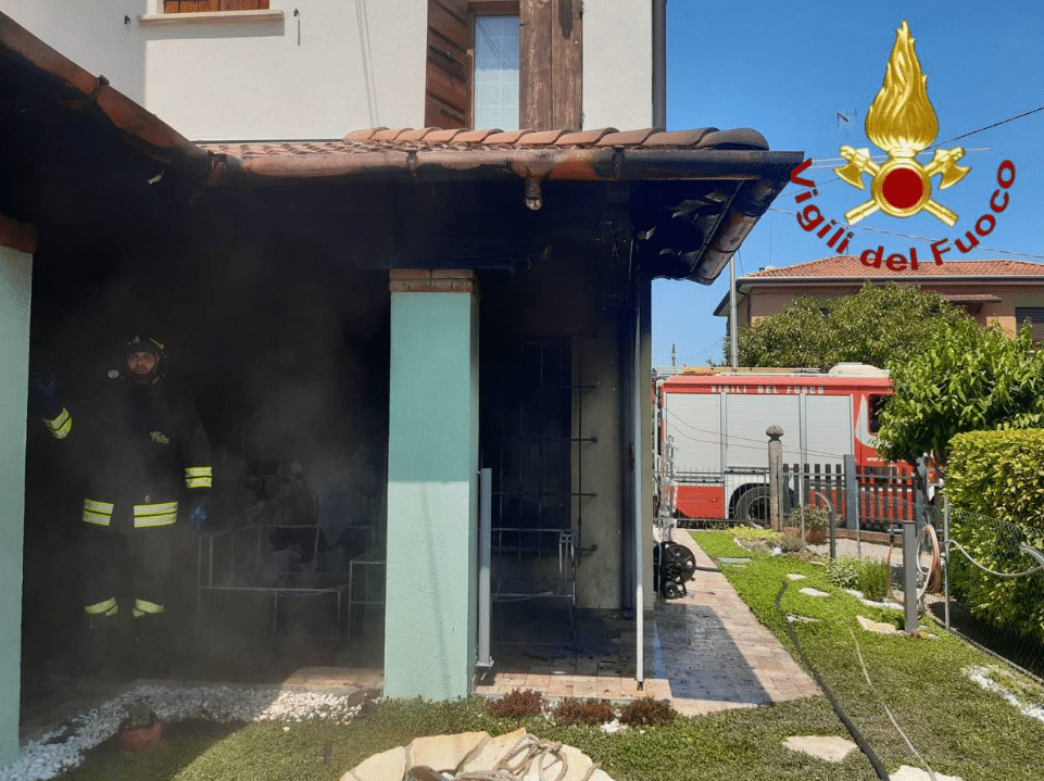 Paura a Treviso per un incendio in una casa: gravi danni al porticato, ma il cane dei proprietari è stato tratto in salvo.