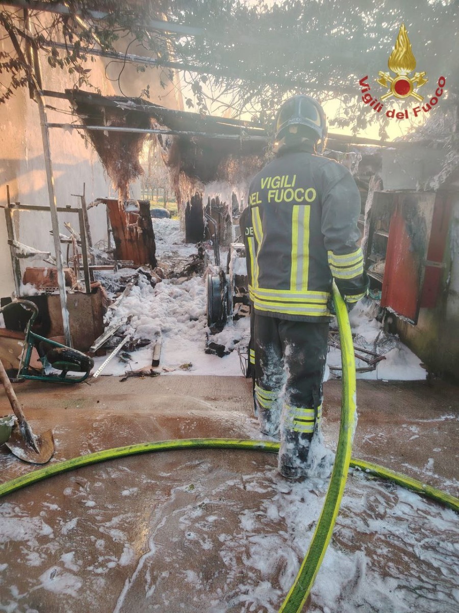 Fiamme in un ricovero attrezzi, esplodono due bombole di GPL: struttura ridotta a "scheletro"