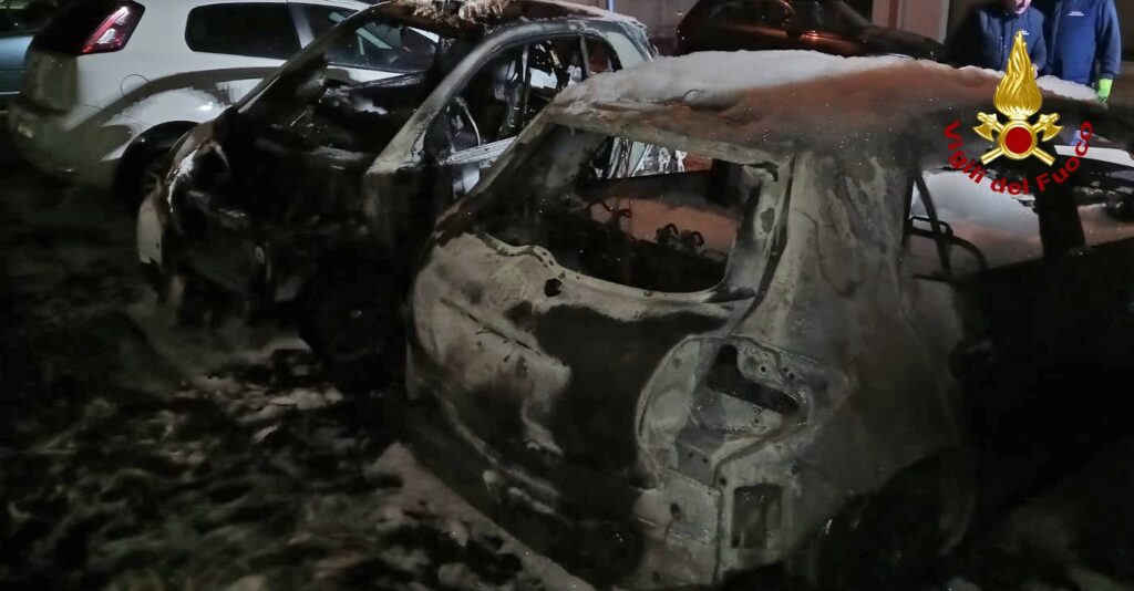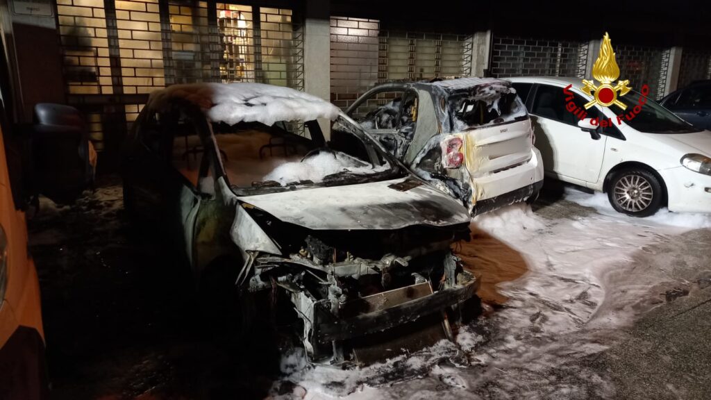 Le fiamme divampate da una prima auto si sono subito estese alla vettura parcheggiata affianco e un furgone, provocando lo scoppio della vetrata di un negozio e l’interessamento della pensilina di un condominio.