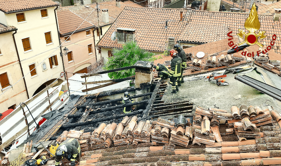 Incendio a Solagna durante lavori al tetto: nessun ferito, ma due alloggi dichiarati inagibili dopo l’intervento dei vigili del fuoco.