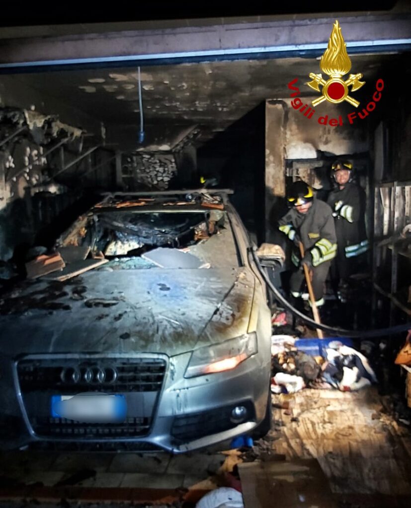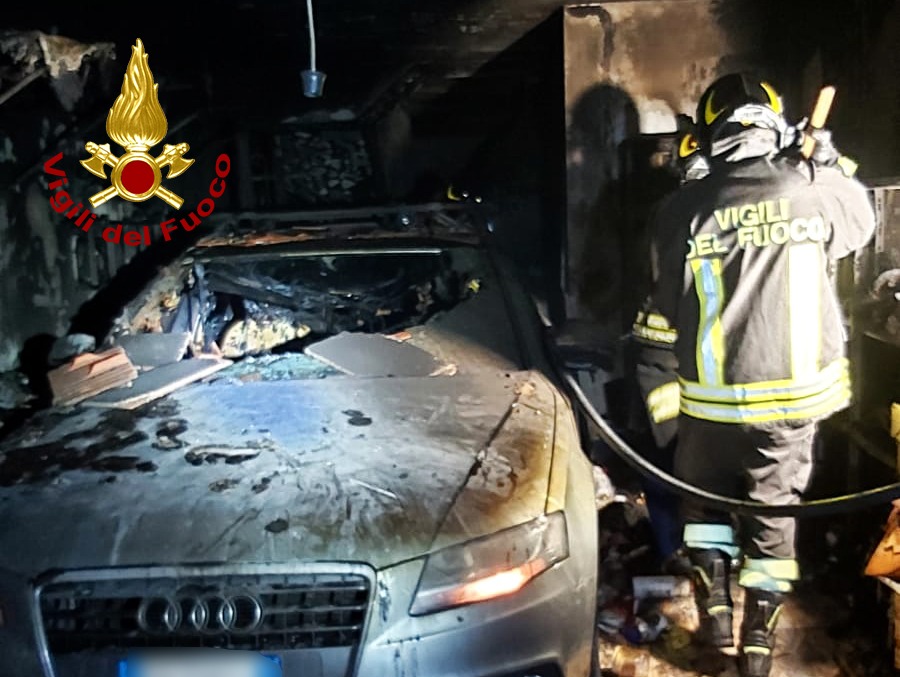 Gravemente danneggiata dalle fiamme un’auto, una piccola officina adibita alla manutenzione degli attrezzi di giardinaggio, vario materiale messo a deposito.