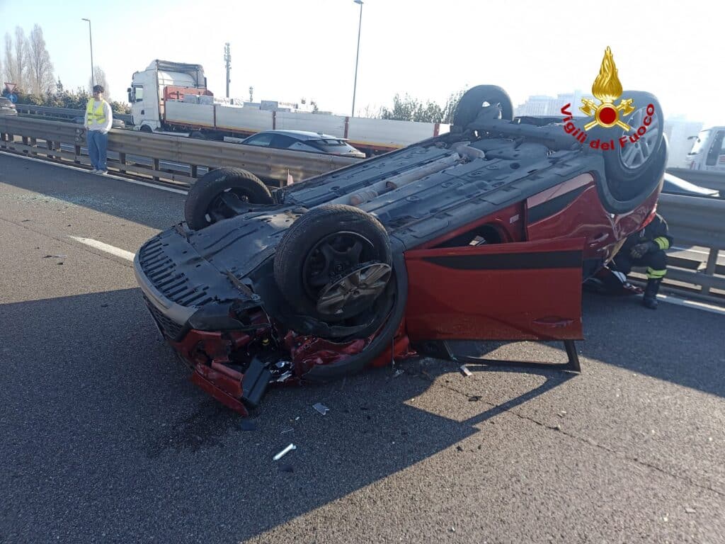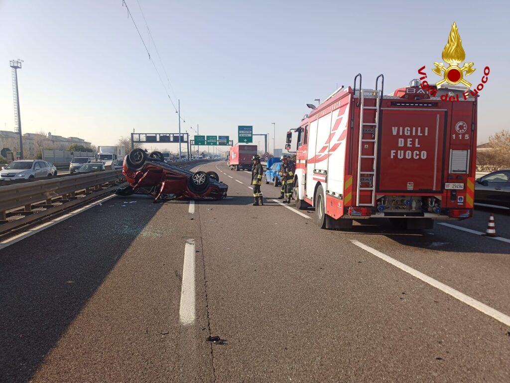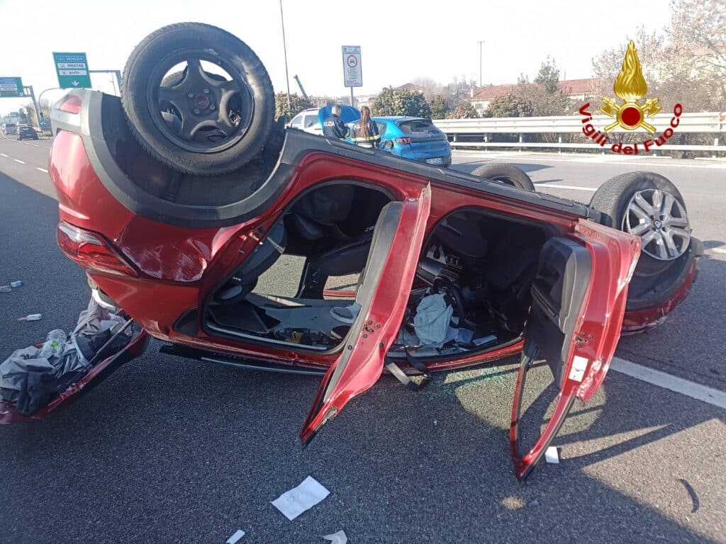Incidente in A57 a Venezia il 6 marzo 2025: due auto coinvolte, una si ribalta. Donna ferita, intervento di vigili del fuoco, Suem e Polstrada.