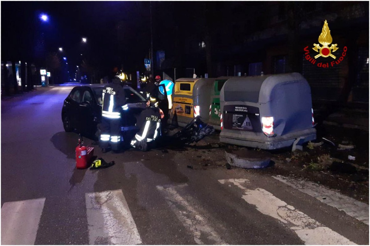 Incidente all'alba: auto finisce contro i cassonetti della raccolta differenziata -