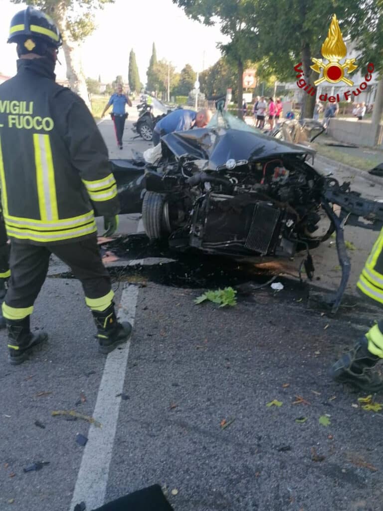 Incidente a Motta di Livenza: auto si spezza dopo l’impatto con due alberi, conducente in gravi condizioni.