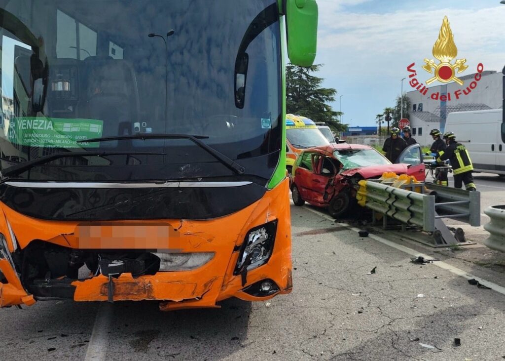 MIRANO (VE). Oggi, venerdì 20 settembre, alle 10:20, un drammatico incidente ha coinvolto un pullman Flixbus e un'automobile in via Stazione, nella località di Ballò, nel comune di MIRANO (VE). Il sin...