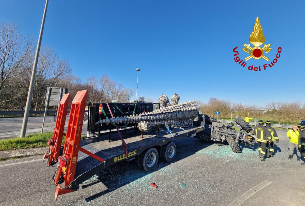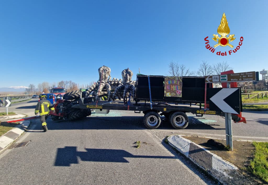 MOTTA DI LIVENZA (TREVISO). Domenica 2 marzo, poco prima delle 9:30, i vigili del fuoco sono intervenuti in Viale Aldo Moro a Motta di Livenza per il ribaltamento di un trattore agricolo che trainava un rimorchio con un carro di Carnevale.