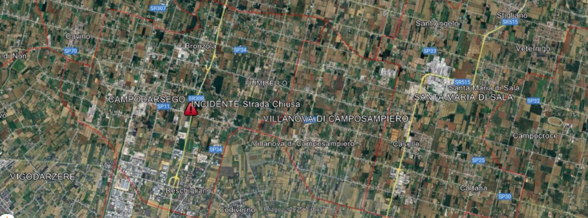 Incidente sulla SR 308 a Campodarsego: strada chiusa in entrambi i sensi al km 9+200 per scontro tra due veicoli.