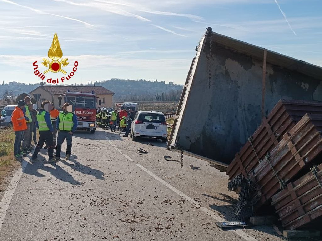 Costermano sul Garda (VERONA). Alle ore 11.20 di oggi, 24 gennaio, i vigili del fuoco sono intervenuti per un incidente stradale che ha coinvolto un mezzo pesante e due autovetture sulla sp9, località San Verolo nel comune di Costermano del Garda.