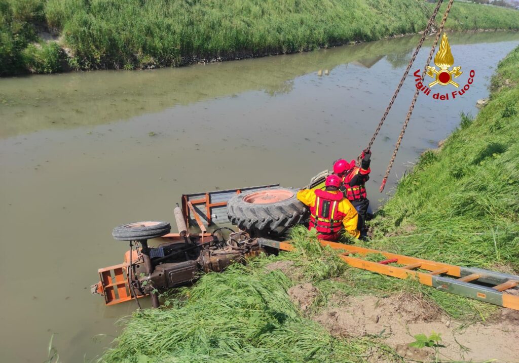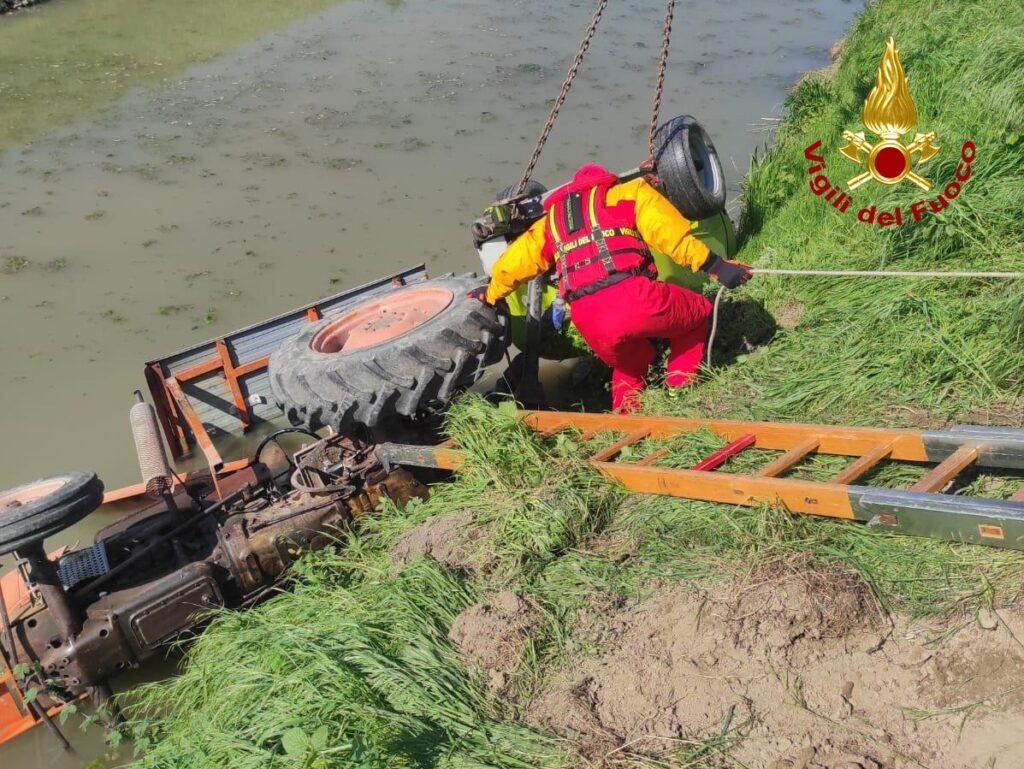 Ancora in corso le operazioni di recupero del trattore da parte dei vigili del fuoco.