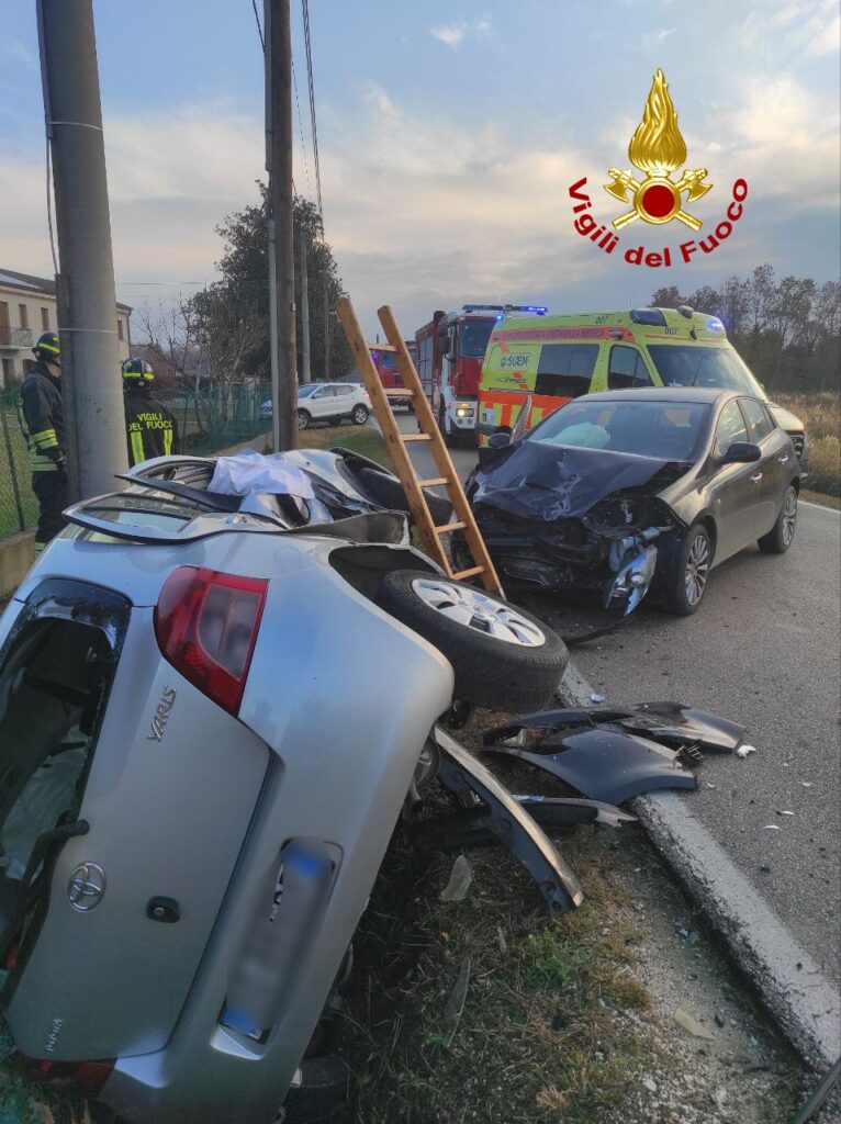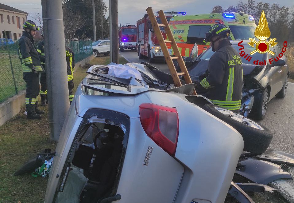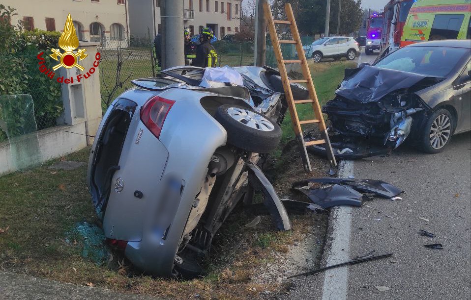 I pompieri accorsi da Treviso, hanno messo in sicurezza le auto ed estratto da una Toyota Yaris rovesciata una 29enne, rimasta bloccata all’interno dell’abitacolo.
