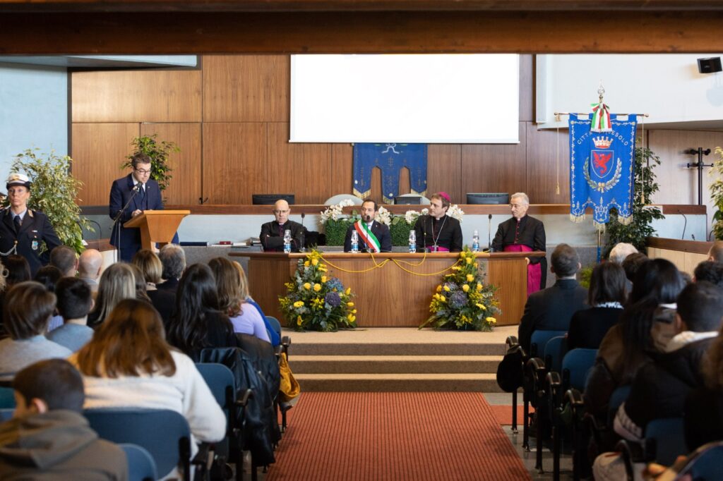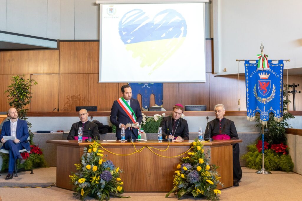 Ad aprire l’incontro con l’amministrazione, il consiglio e la cittadinanza è stata l’esibizione del coro San Sebastiano del Comune di Jesolo che ha cantato “Signore delle cime”, dedicando il brano a tutti i caduti di ogni guerra, e l’“Hallelujah” di Leonard Cohen. A dare il benvenuto e portare il loro messaggio di sostegno al vescovo Yazlovetskij sono stati poi il sindaco dei ragazzi, Daisy Zorzetto, gli studenti delle scuole Michelangelo, che hanno donato al vescovo una tela con dei loro versi, D’annunzio, in rappresentanza dei quali è intervenuto un compagno di origine ucraina, e Cornaro. Questi ultimi hanno illustrato il progetto sugli acrostici, realizzato nei mesi scorsi ed esposto in sala consiliare.