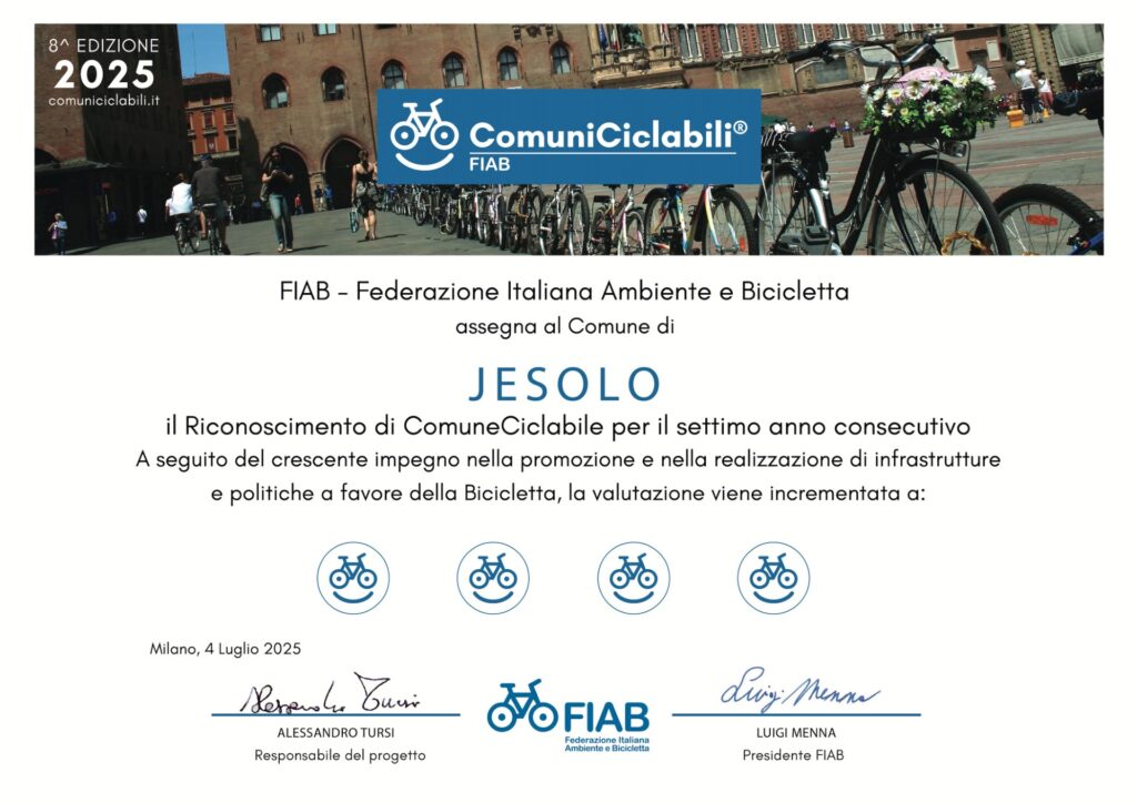 La cerimonia di consegna si è svolta il 4 luglio a Milano, alla presenza del consigliere delegato alla mobilità Andrea Carpenedo, che ha illustrato le azioni messe in campo per incentivare l’uso della bicicletta, potenziare la sicurezza stradale e ampliare la rete delle piste ciclabili in città. L’obiettivo dichiarato è quello di trasformare Jesolo in un modello di vivibilità urbana e sostenibilità ambientale, con interventi concreti, visibili e già apprezzati dai cittadini.