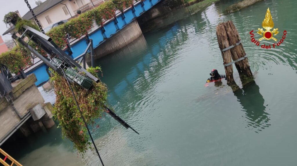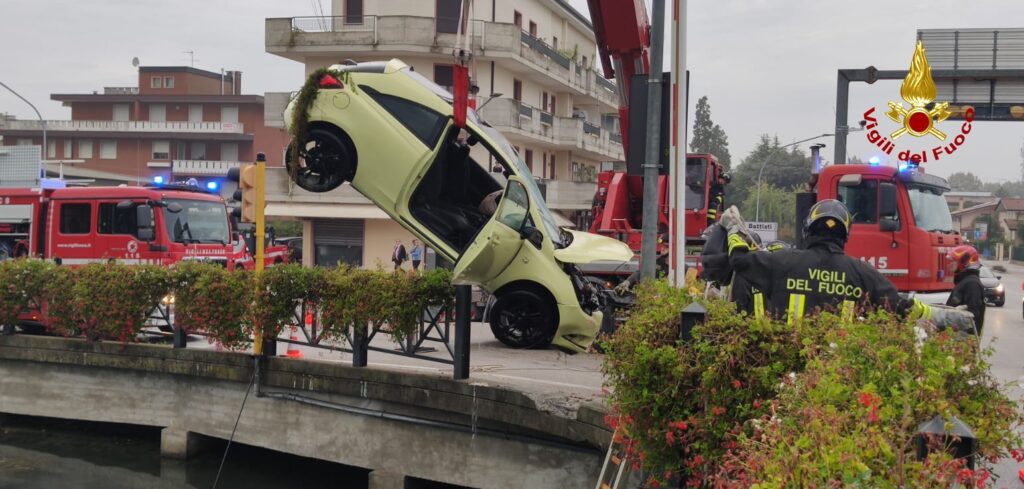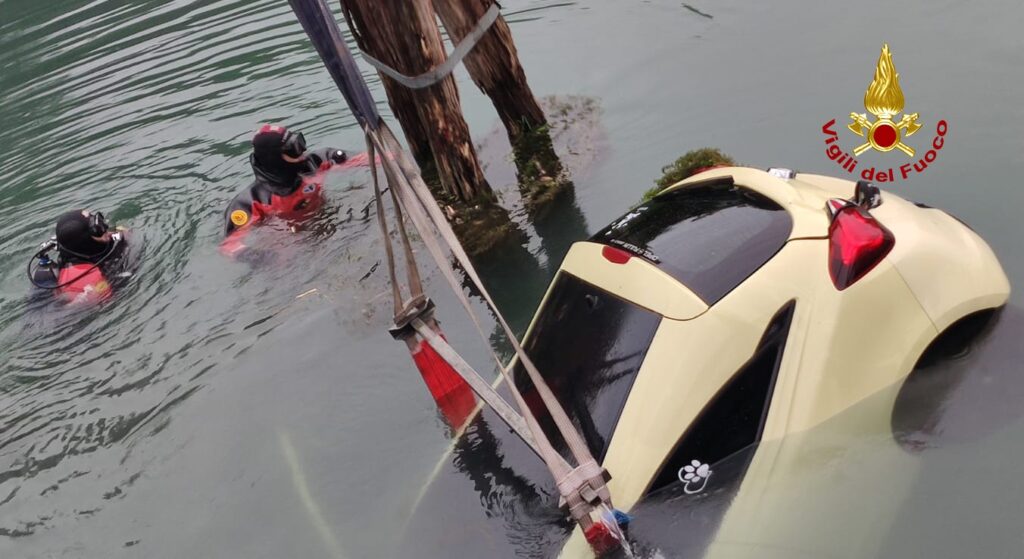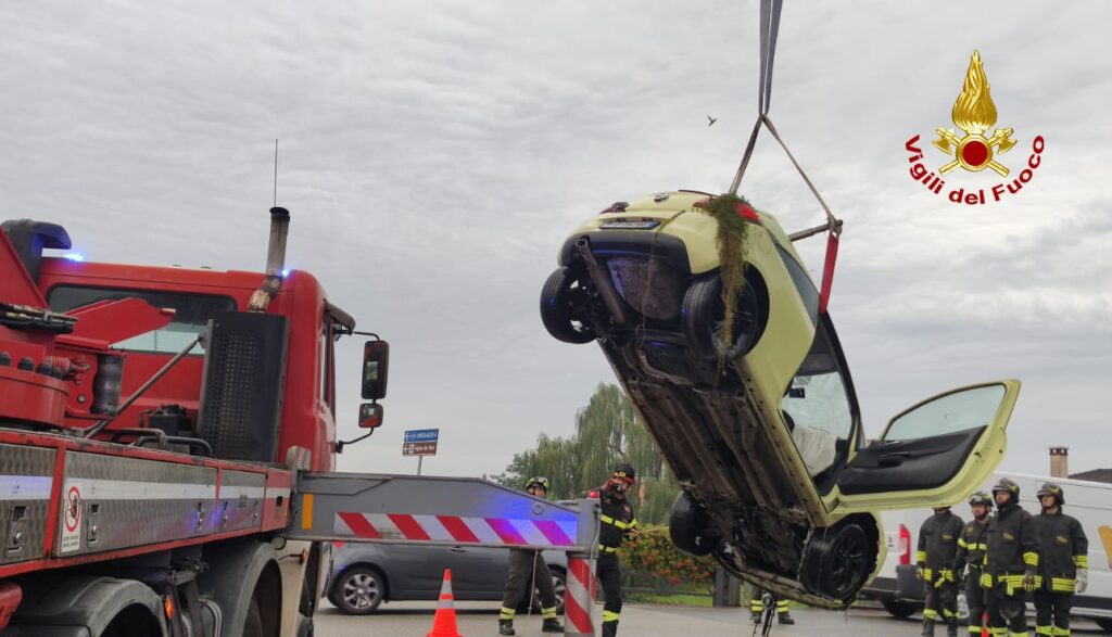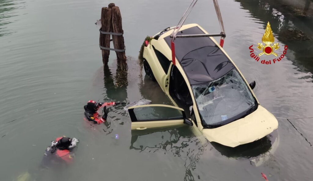 I vigili del fuoco arrivati dal locale distaccamento e Mestre con l’autogrù e il nucleo sommozzatori, hanno individuato nel canale l’auto che è stata imbragata e riportata in strada.