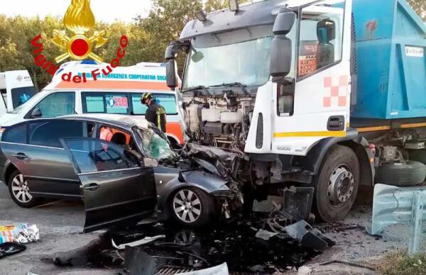 Terribile schianto tra auto e camion, due feriti liberati dai pompieri: elitrasportati all'ospedale