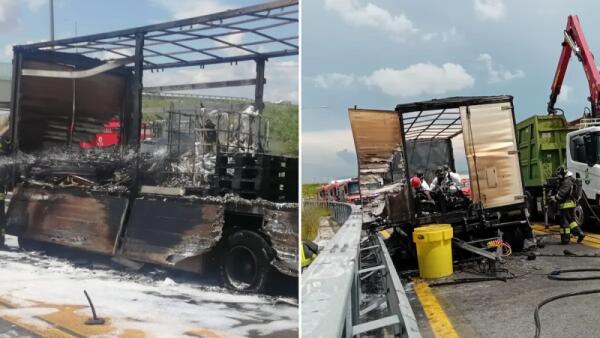 Semirimorchio a fuoco sull'A4: bruciate batterie al litio, pannelli solari e lampade al neon