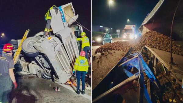 Camion si ribalta sulla Romea, il carico di barbabietole invade la carreggiata: un ferito