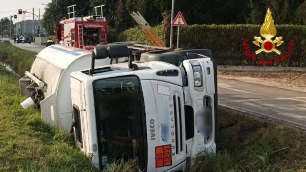 Autocisterna con oltre 11mila litri di gasolio si rovescia in un fossato