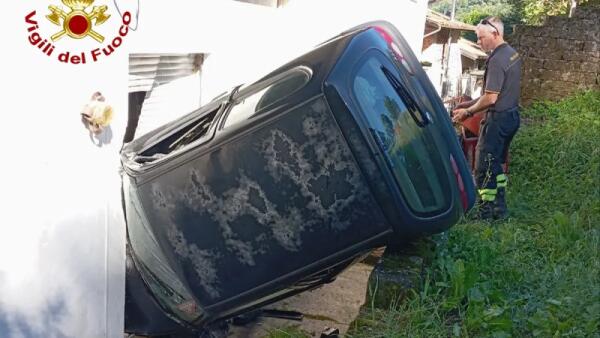 Auto si muove da sola e finisce in una scarpata contro il muro di un'abitazione