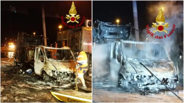 Camper in fiamme all'uscita del casello della SPV, esplode una bombola GPL