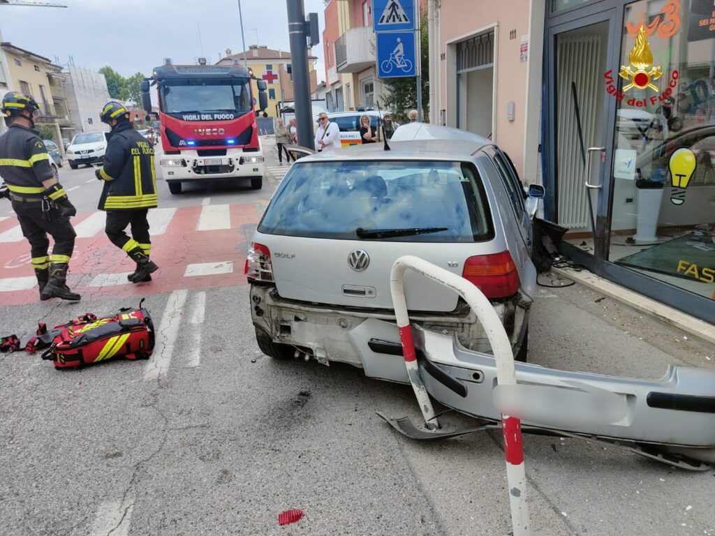 Il conducente per un malore ha perso il controllo del mezzo abbattendo gli archetti para pedonali della pista ciclabile e la porta vetro di un negozio: nessun’altra persona ferita.