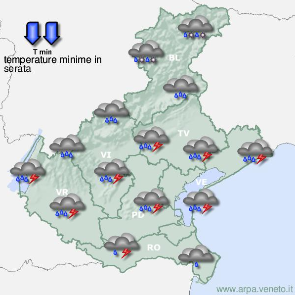 I temporali potrebbero risultare intensi, con forti rovesci, locali grandinate e forti raffiche di vento, in particolare tra le Prealpi e la pianura. È previsto un marcato calo termico nella seconda parte di giovedì, con il limite della neve che potrebbe abbassarsi fino a circa 1500 metri sulle Dolomiti e 2000/2300 metri sulle Prealpi.