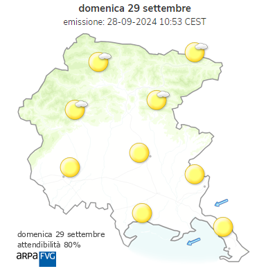 In Friuli Venezia Giulia domenica bel tempo: cielo sereno o poco nuvoloso. A Trieste soffierà Bora moderata al mattino, in attenuazione durante la giornata. Temperature minime in netto calo.