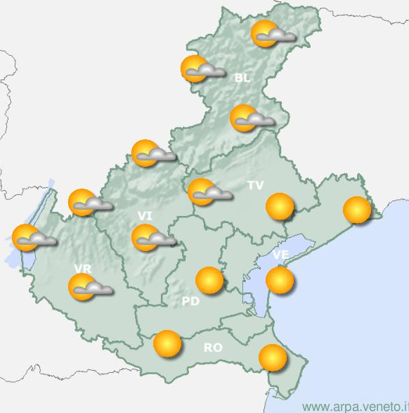 In Veneto cielo in prevalenza sereno o poco nuvoloso, verso sera leggero/moderato aumento della nuvolosità. Precipitazioni assenti. Temperature in calo, eccetto andamenti irregolari diurni sui monti, con differenze anche sensibili rispetto a sabato. Valori sotto la media, anche di molto. Venti in pianura deboli/moderati, su costa e zone limitrofe fino al mattino da nord-est, per il resto con direzione variabile. Nelle valli deboli/moderati con direzione variabile. In alta montagna moderati da ovest. Mare da mosso a poco mosso col passar delle ore.