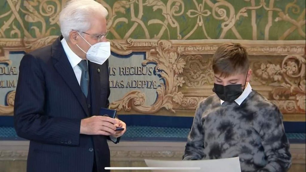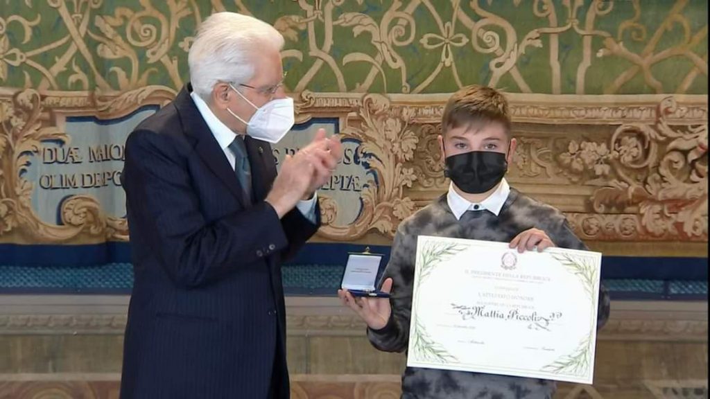 Nella giornata di oggi, martedi 14 dicembre 2021, Mattia è salito al Quirinale per ricevere dalle mani del Presidente della Repubblica, Sergio Mattarella, l’attestato d’onore.