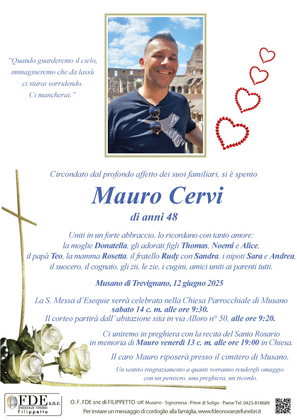 L’ultimo saluto a Mauro Cervi si terrà sabato alle ore 9.30 nella chiesa parrocchiale di Musano. Lascia, oltre alla moglie e ai figli, anche il padre Teo, la madre Rosetta, il fratello Rudy e molti amici e parenti che lo ricordano con affetto.