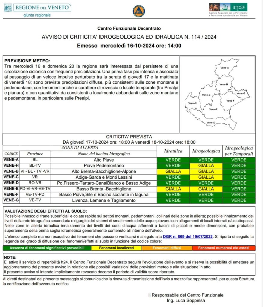 A fronte di queste previsioni, il Centro Funzionale Decentrato della Protezione Civile regionale ha diramato un avviso di criticità idrogeologica e idraulica, valido a partire da domani, giovedì 17, alle ore 18, fino a venerdì 18 alle ore 18. In particolare, è stata dichiarata allerta gialla per criticità idraulica nei bacini di Alto Brenta-Bacchiglione-Alpone e Basso Brenta-Bacchiglione. Allerta gialla anche per criticità idrogeologica nei bacini di Piave Pedemontano, Alto Brenta-Bacchiglione-Alpone, Adige-Garda e Monti Lessini, e Basso Brenta-Bacchiglione.