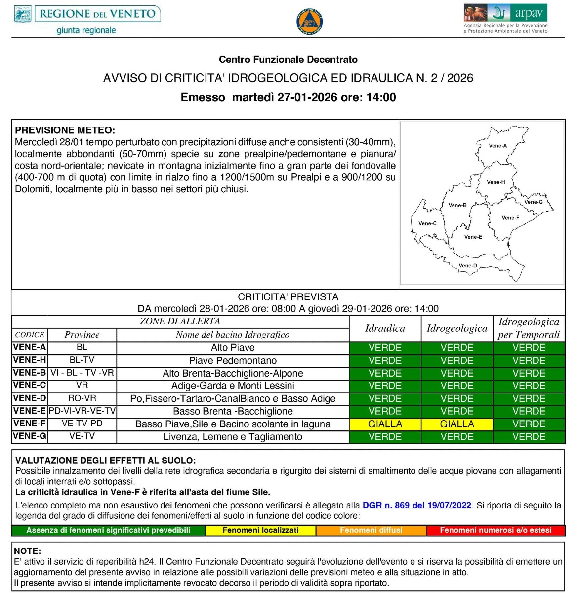 Oltre alla neve in montagna, è prevista anche una criticità gialla per rischio idrogeologico ed idraulico nelle zone di pianura. In particolare, lo stato di attenzione riguarda l’area VENE-F, che comprende Basso Piave, Sile e bacino scolante in laguna.