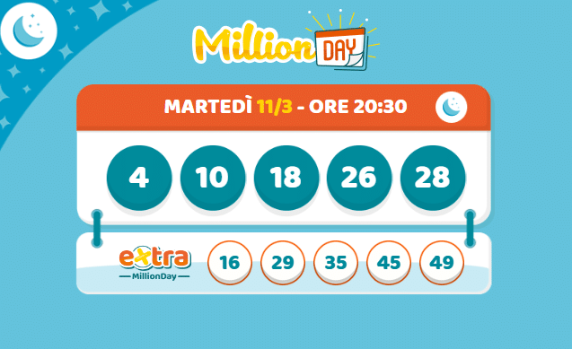 Scopri i numeri vincenti di oggi, martedì 11 marzo 2025, per Million Day e Million Day Extra. Estrazione ore 20:30. Partecipa e prova la fortuna!