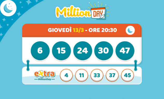 Scopri i numeri vincenti del Million Day e Million Day Extra di giovedì 13 marzo 2025. Estrazione alle ore 20:30! Verifica subito se sei il prossimo vincitore.