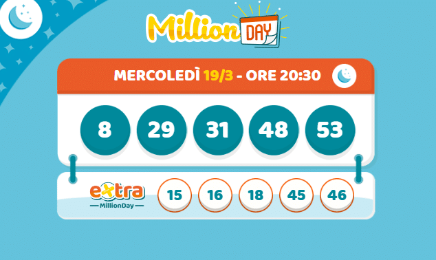 Siamo giunti al momento tanto atteso, l'estrazione di oggi, mercoledì 19 marzo 2025, delle ore 20:30. Ecco i numeri vincenti per il Million Day e il Million Day Extra: