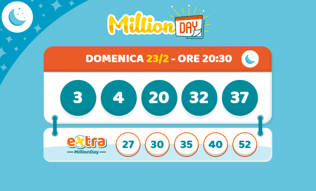 Scopri i numeri vincenti di oggi, domenica 23 febbraio 2025, per Million Day e Million Day Extra. Estrazione alle 20:30. Scopri se sei il prossimo fortunato vincitore!