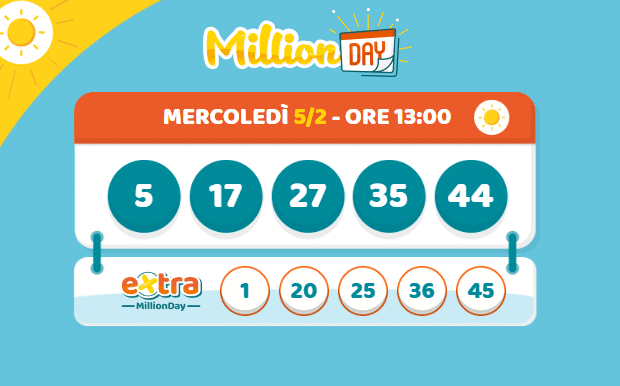Scopri i numeri vincenti dell’estrazione Million Day e Million Day Extra del 5 febbraio 2025, ore 13:00. Controlla subito se sei il prossimo milionario!