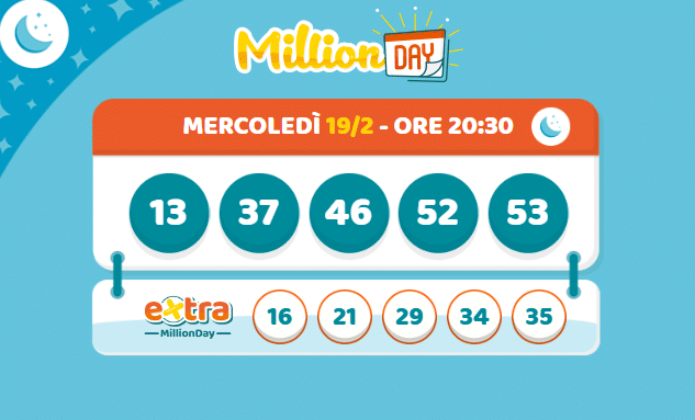 Oggi, mercoledì 19 febbraio 2025, i numeri vincenti del Million Day e del Million Day Extra sono stati finalmente estratti. Se hai partecipato, non dimenticare di verificare subito la tua giocata per scoprire se sei tra i fortunati vincitori. Se la fortuna non ti ha sorriso questa volta, non disperare: ci sono nuove estrazioni ogni giorno e nuove possibilità di vincita.