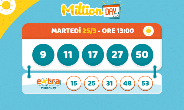 Oggi, martedì 25 marzo 2025, l'estrazione del Million Day e del Million Day Extra si terrà alle ore 13:00. Ecco i numeri estratti che potrebbero cambiarti la vita: