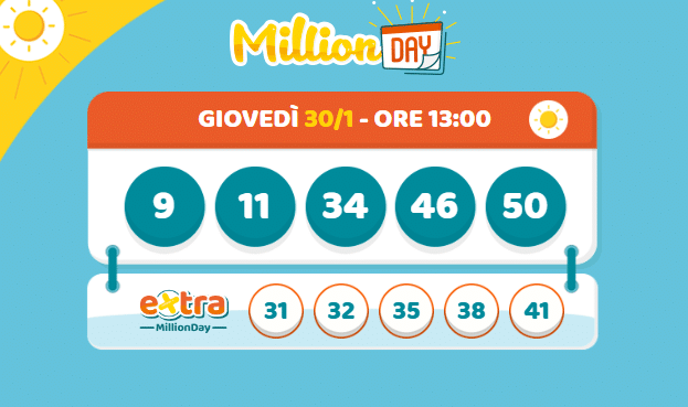 Scopri i numeri vincenti del Million Day e Million Day Extra di oggi, 30 gennaio 2025. Estrazione alle 13:00. Scopri come partecipare.