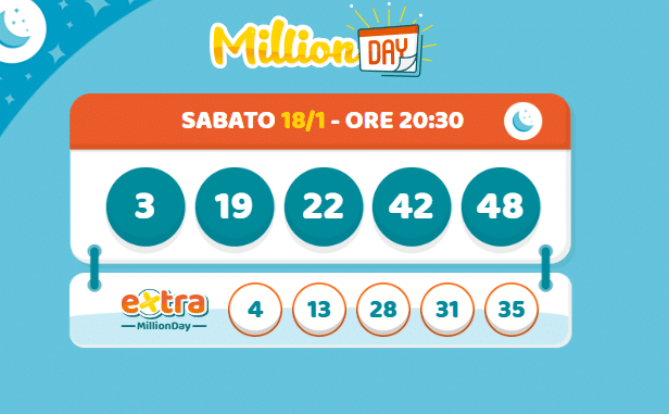 Scopri i numeri vincenti di Million Day e Million Day Extra di sabato 18 gennaio 2025. Un milione di euro in palio nel Million Day.