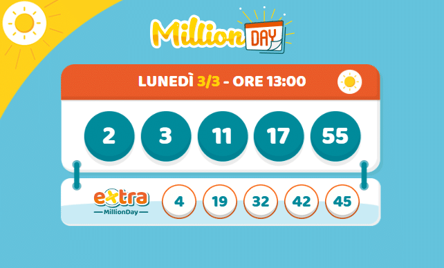 Scopri i numeri vincenti dell'estrazione del Million Day e Million Day Extra di oggi, lunedì 3 marzo 2025, e prova a vincere un milione di euro.