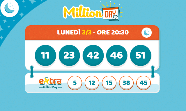 Scopri i numeri vincenti dell'estrazione del Million Day e Million Day Extra di oggi, lunedì 3 marzo 2025, e prova a vincere un milione di euro.
