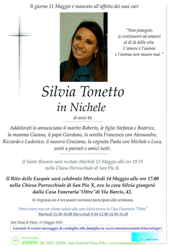 SAN DONÀ DI PIAVE (VENEZIA) – Una comunità intera si stringe nel dolore per la scomparsa di Silvia Tonetto, venuta a mancare a soli 44 anni dopo una lunga battaglia contro la malattia. Lascia il marito Roberto, due figlie adolescenti, Stefania e Beatrice, e una famiglia profondamente legata a lei.