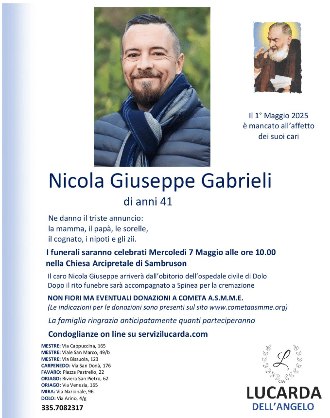 I funerali di Nicola Gabrieli si terranno mercoledì 7 maggio alle ore 10:00 nella chiesa arcipretale di Sambruson, seguiti dalla cremazione. La famiglia ha richiesto che eventuali donazioni vengano destinate all’associazione Cometa. Un ultimo gesto di solidarietà per onorare la memoria di un uomo che ha lasciato un segno nella vita di tutti coloro che lo hanno conosciuto.