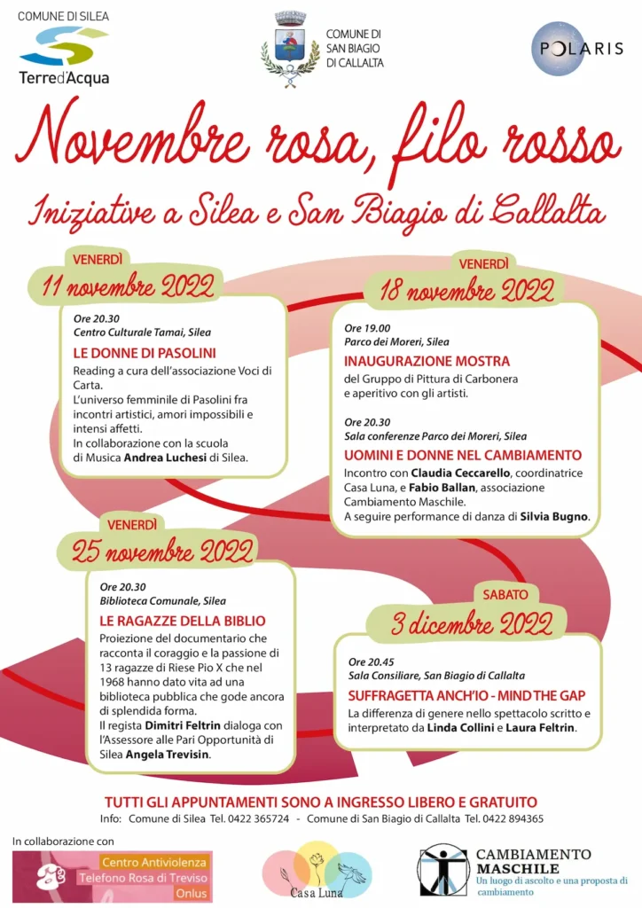 Silea, 07.11.2022. Il Comune di Silea l’associazione Auser Polaris promuove il progetto “Novembre rosa, filo rosso”,un ricco calendario di iniziative che da venerdì 18 novembre si svilupperà toccando anche il Comune di San Biagio di Callalta, approfondendo il tema del contrasto della violenza sulle donne e della prevenzione.
