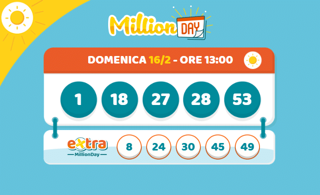 Scopri i numeri vincenti di oggi, domenica 16 febbraio 2025, per Million Day e Million Day Extra, estrazione ore 13:00. Controlla se hai vinto!