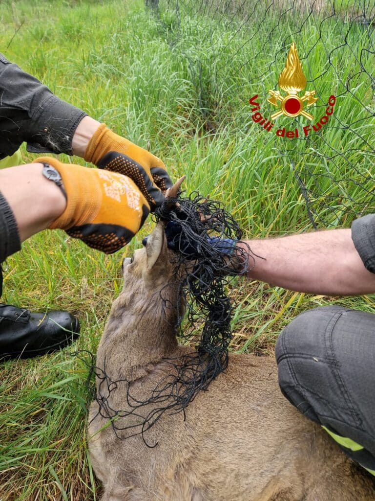 Pederobba, capriolo liberato dai Vigili del Fuoco dopo essere rimasto intrappolato in una rete.