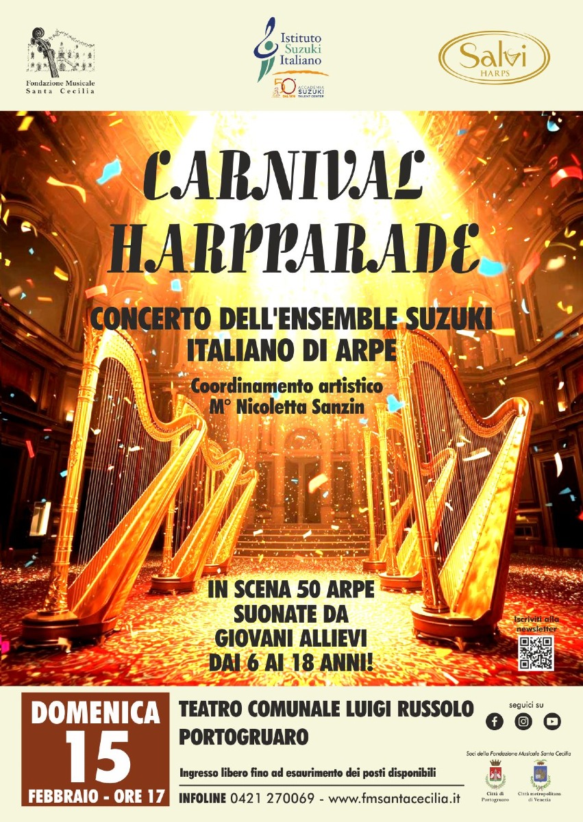 PORTOGRUARO (VE) - Dal 13 al 15 febbraio 2026, in occasione del cinquantesimo anniversario della nascita del Metodo Suzuki in Italia, la Fondazione Musicale Santa Cecilia sarà promotrice di un evento assolutamente inedito sia per il territorio di Portogruaro sia il Nord Est in generale, ospitando un corso di formazione docenti (venerdì 13 febbraio) e un Workshop dedicato alla Musica d’insieme per arpe (sabato 14 e domenica 15 febbraio).